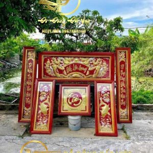 - Ở đây, cuốn thư được lồng ghép trong khuôn khổ hình chữ nhật. Hai đầu cuốn thư là hai vật phẩm lần lượt đại diện cho văn và võ. Đó chính là cây bút lông và cây kiếm. Bao bọc quanh chúng là hình ảnh của khóm mẫu đơn và con chim Khổng Tước đậu bên. Trên bề mặt cuốn thư, những chữ Thọ triện được thể hiện khéo léo. Những nếp gấp khiến các chữ xuất hiện một nửa. Điều này tạo nên nét bí ẩn cho sản phẩm.
