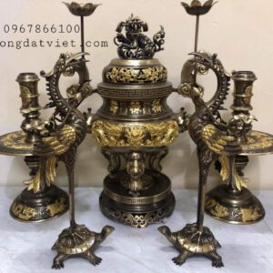 bộ đồ thờ đỉnh đồng dát vàng 24k _ ngũ sự: đỉnh đồng, 2 hạc, 2 nến _ hàng cao cấp