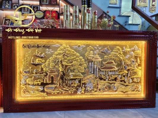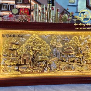 Đặt mua Tranh 1m20x2m30 đồng quê ( cây da giếng nước sân đình ), chất liệu đồng vàng giả cổ dát vàng – Khung gỗ